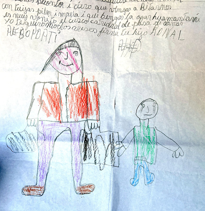 En el Hogar unos niños nos portamos bien, otros más o menos. Y otros saben fastidiar. Otros cogen las cosas con sin permiso. Como el Herson, que siempre para fastidiando a todos. Pero sabe decirle cosas bonitas a las mamis. “Reina”, “Princesa”, “Mami, te quiero tanto como a mi Perú. No, te quiero más que a mi Perú”, “Cuando te mueras te llevaré hartas flores al cementerio”, “Si tú te mueres, me hago pisar por el tren”, y así las mamis se quedan contentas y se hace perdonar. También yo sé decir lindas cosas a las mamis: “Todo el día yo te quiero”, “yo cuando estoy, te quiero mucho”, “te quiero porte del cielo”, “te quiero hasta su corazón de Dios”, “eres una bonita”,“que te sueñes con tus angelitos”. Y también les escribimos cartas con dibujos, y las mamis tienen hartas cartas nuestras.